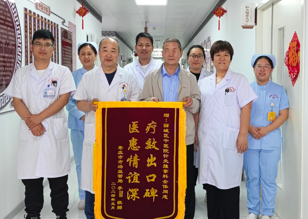 5月7日,患者李大爷将一面印有“疗效出口碑 医患情谊深”的锦旗送到了薛城区中医院针灸推拿科医护人员手中。锦旗上熠熠生辉的大字,表达了患者对该院针灸推拿科医德医术的认可和肯定。