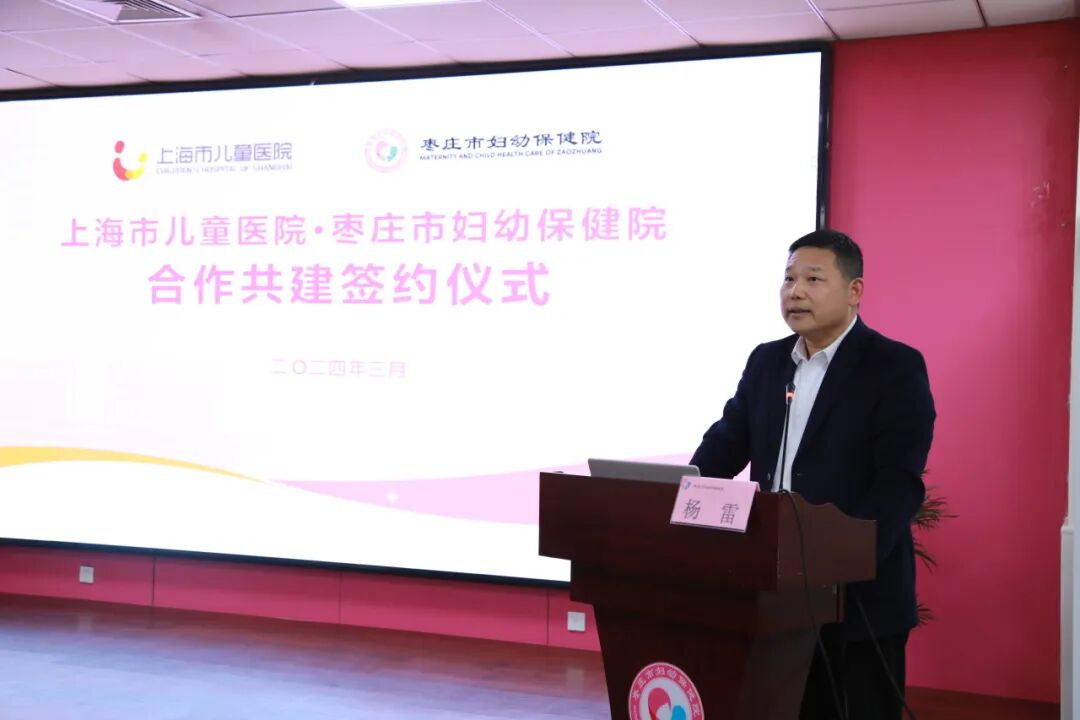 杨雷指出,市妇幼保健院作为我市妇幼保健医联体龙头单位,是全国首批实施标准化建设和规范化管理的三级甲等妇幼保健院。医院在提升妇幼健康服务质量和水平、保障母婴安全、维护妇女儿童健康权益等方面发挥着显著的引领带动作用,为枣庄经济社会发展和人民群众幸福安康作出了积极贡献。今天,市妇幼保健院成为上海市儿童医院共建单位,这是助推枣庄妇幼健康事业发展的一件大事,也是造福枣庄群众的一件好事,必将进一步促进两院深层次的交流与合作,开启枣庄儿童医学事业高质量发展的新篇章。