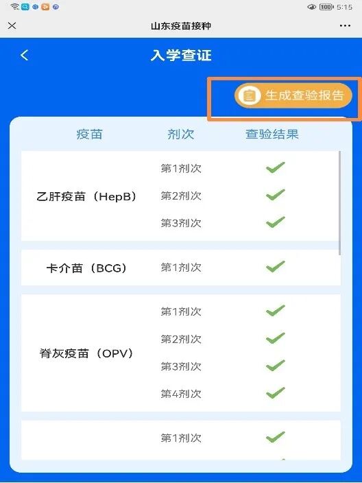 绑定成功后,点击界面的“入学查证”按钮,生成查验报告,点击查看儿童是否完成所有针次,如未完成请到就近接种门诊完成相应针次,如已全部完成,点击界面右上方的“导出”按钮,复制导出地址,粘贴到浏览器地址栏,下载查验报告。