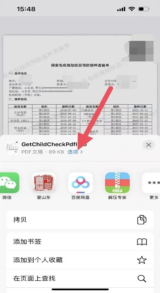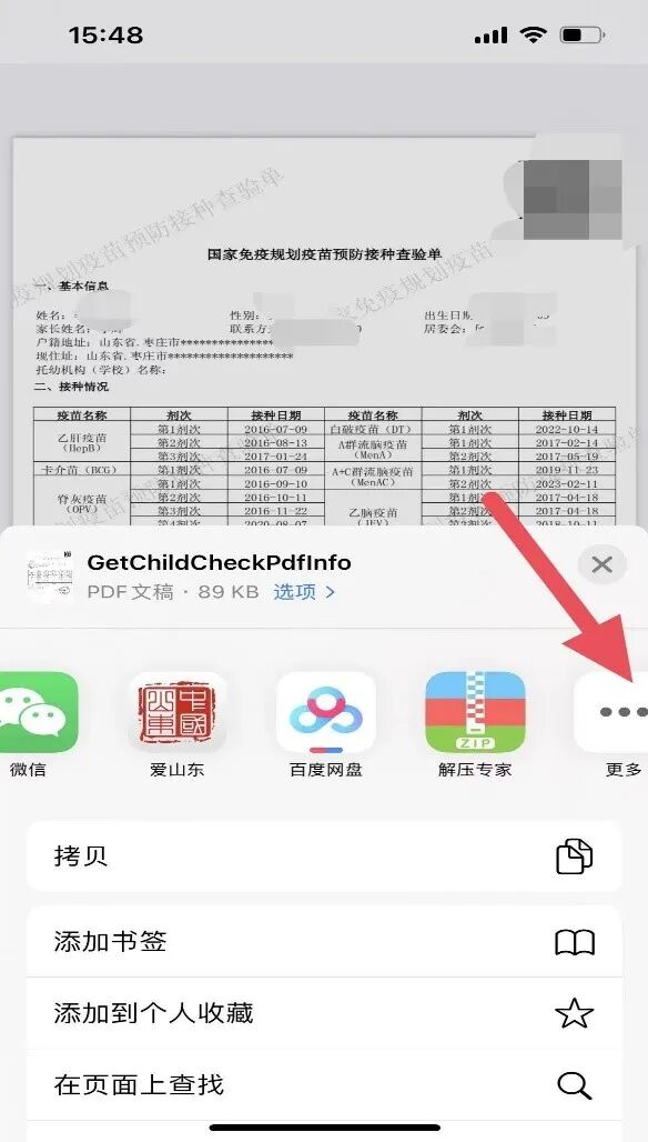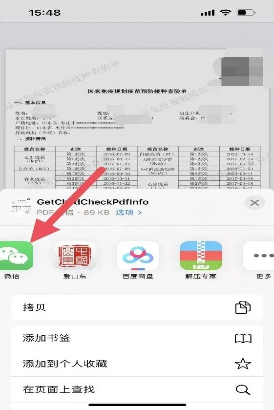 如果使用苹果手机进行操作,复制导出地址,粘贴到浏览器地址栏,需要点击“分享”,并选择PDF格式,发送至微信APP即可(不常使用的用户,可以在更多里面找微信APP)。