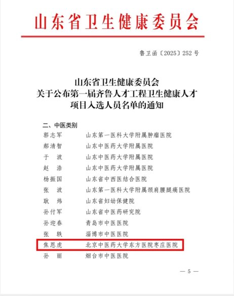 近日,山东省卫生健康委公布第一届齐鲁人才工程卫生健康人才项目评选结果,北京中医药大学东方医院枣庄医院治未病科主任焦恩虎成功入选,成为枣庄市在该项目评选中首位获此殊荣的卫生健康人才。此次成功入选,充分展现了市卫生健康委在优秀中青年专家培养机制上的成效, 标志着枣庄市在全省卫生健康人才队伍建设方面取得了新的突破。