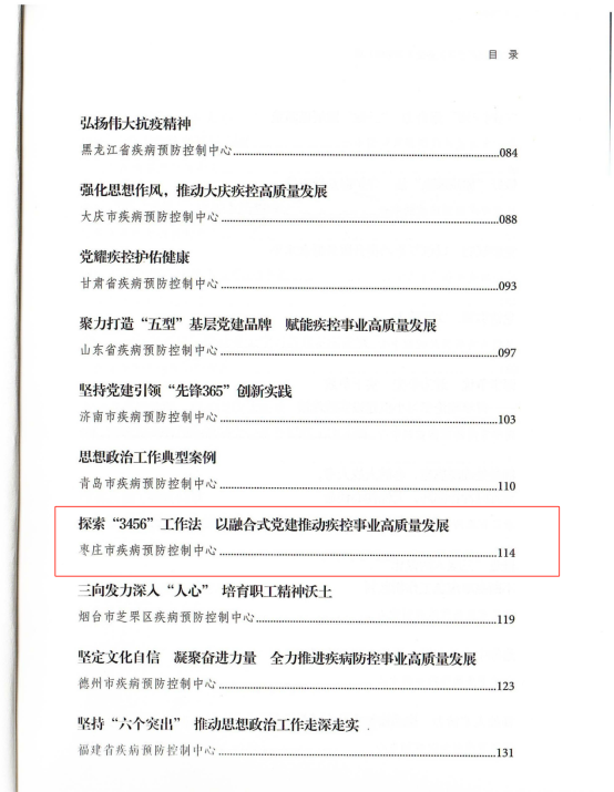 近日,中国疾病预防控制中心(中国预防医学科学院)印发了《疾控系统思想政治典型工作案例汇编》,市疾病预防控制中心报送的《探索“3456”工作法 以融合式党建推动疾控事业高质量发展》成功入选,标志着枣庄疾控党建与业务融合发展成果获得国家级认可!。