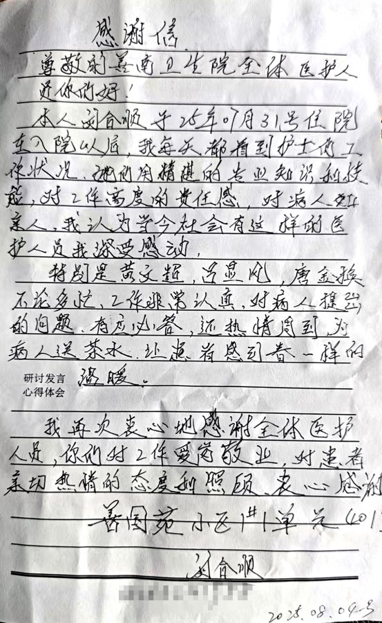 这封感谢信,不仅是对个人服务的肯定,也是对护理团队用爱心、耐心、细心和责任心无私奉献传递爱和温暖力量的礼赞,更是对全体医护人员“以患者为中心 践行医者使命”生动再现。