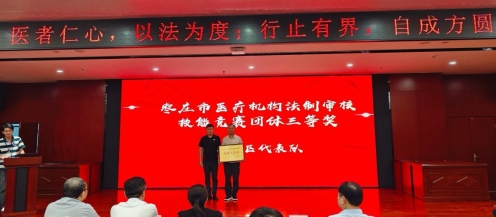 本次团体赛设置理论测试、案例评析展示两大环节,聚焦卫生健康法律法规、法律风险识别、法制审核实务等核心内容,全面检验参赛队伍的专业能力与协作水平。经过多轮激烈角逐,最终滕州市代表队斩获团体一等奖;枣庄市精神卫生中心、枣庄市皮肤病性病防治院、山东健康集团枣庄中心医院组成的联合队荣获团体二等奖;市中区代表队获得团体三等奖。