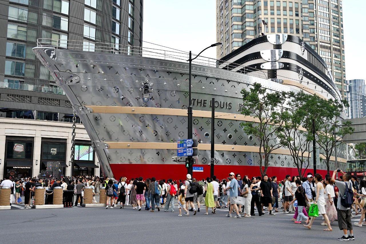 而不久前,上海静安兴业太古汇门前,一艘高30米、长114.5米的“巨轮”——“路易号”揭开神秘面纱。红银相间的船身,以经典LV(路易威登)旅行箱叠加堆砌而成,巨型锁扣与铆钉的金属质感不仅延续了品牌深厚的历史基因,也映衬出上海这座城市的海港气质。