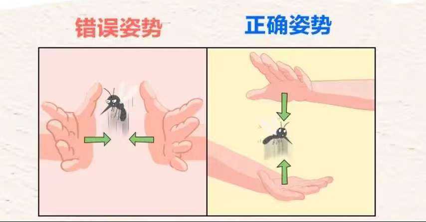 竖:双手上下摆好,手指微张,减少阻力。蚊子遇袭时多上下逃窜,因此不要采取左右“鼓掌”姿势。