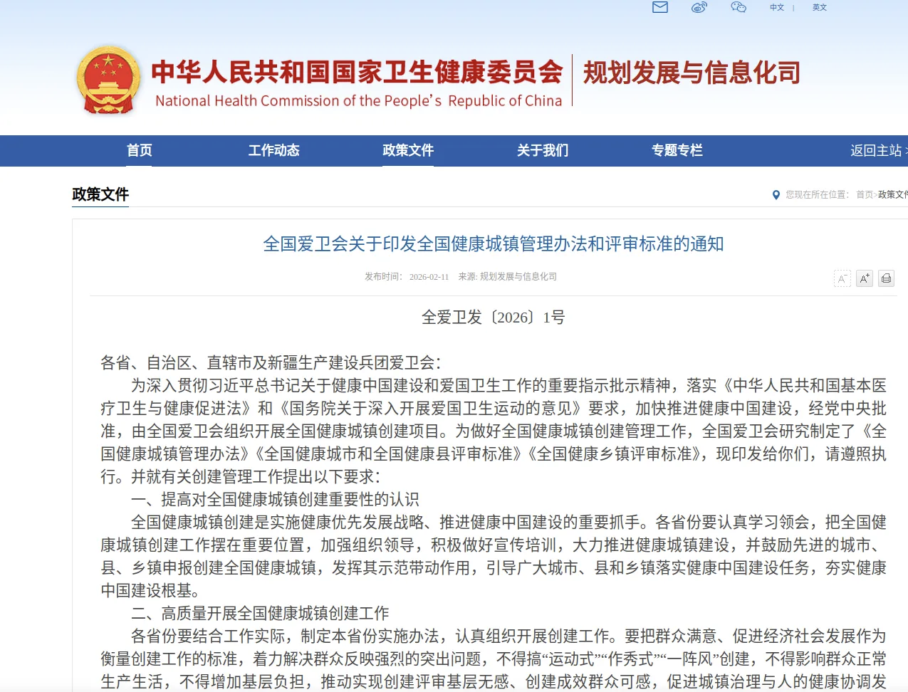 第二条 各地要锚定2035年建成健康中国目标任务,因地制宜积极开展全国健康城镇创建,实施健康优先发展战略,完善促进健康的政策机制,普及健康生活,优化健康服务,完善健康保障,建设健康环境,促进社会治理与人的健康协调发展,全面推进健康中国建设。对于积极开展创建工作,符合评审标准并能够在全国发挥示范作用的城市、县和乡镇,由全国爱国卫生运动委员会(以下简称全国爱卫会)予以认定命名。