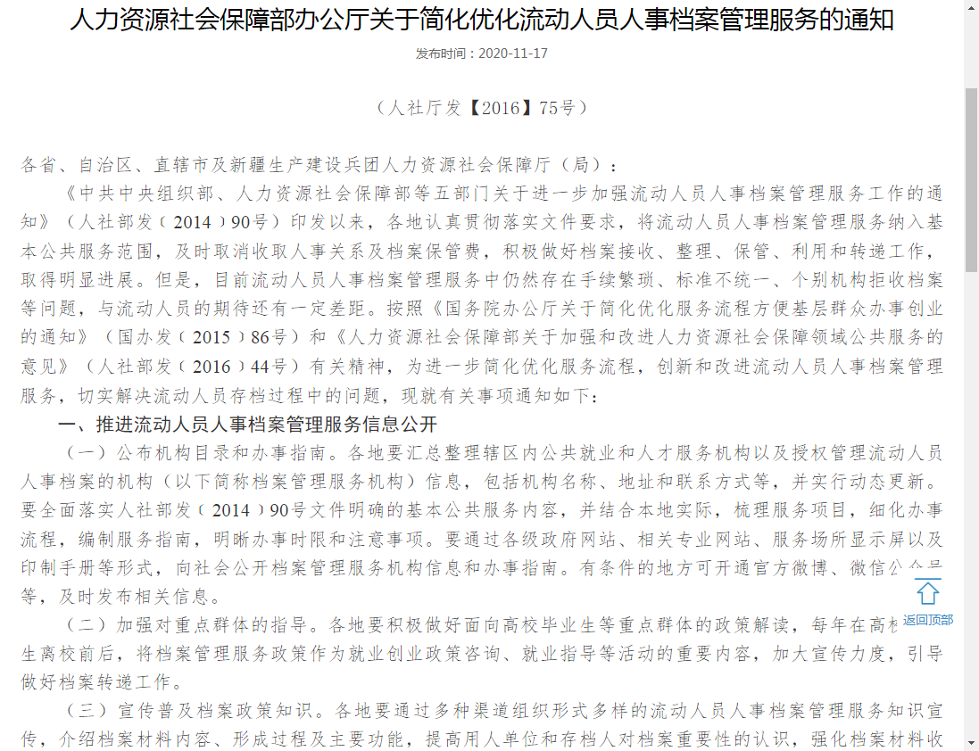 人力资源社会保障部办公厅关于简化优化流动人员人事档案管理服务的通知