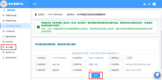 2.点击左侧【网上缴费】,核对报考专业、科目和金额,确认无误后点击“支付”跳转至考区指定的缴费平台,完成缴费。
