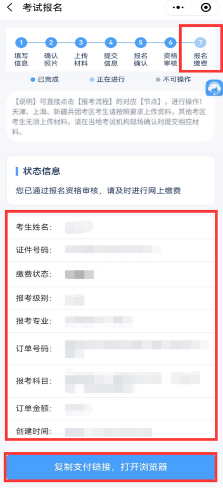 2.点击报考流程上的“报名缴费”节点,核对报考专业、科目和金额,确认无误后复制支付链接,打开浏览器,完成缴费。