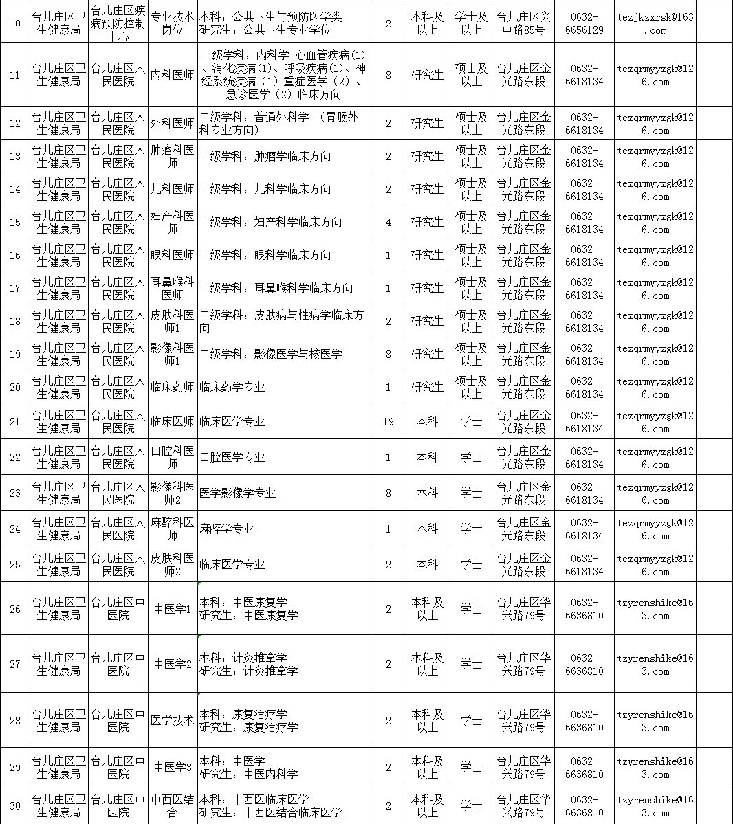 台儿庄区4个事业单位共提供急需紧缺专业(岗位)30个、人才需求94人。其中,医疗卫生单位提供21个岗位,人才需求74人。