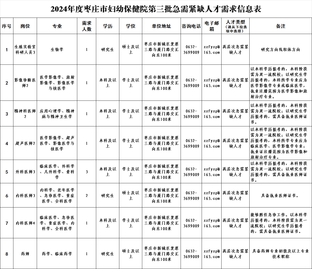 招聘岗位、专业及具体要求详见《2024年度枣庄市妇幼保健院第三批急需紧缺人才需求信息表》,或者登录官网查询相关附件:https://www.zzsfybjy.com/html/3203.htm