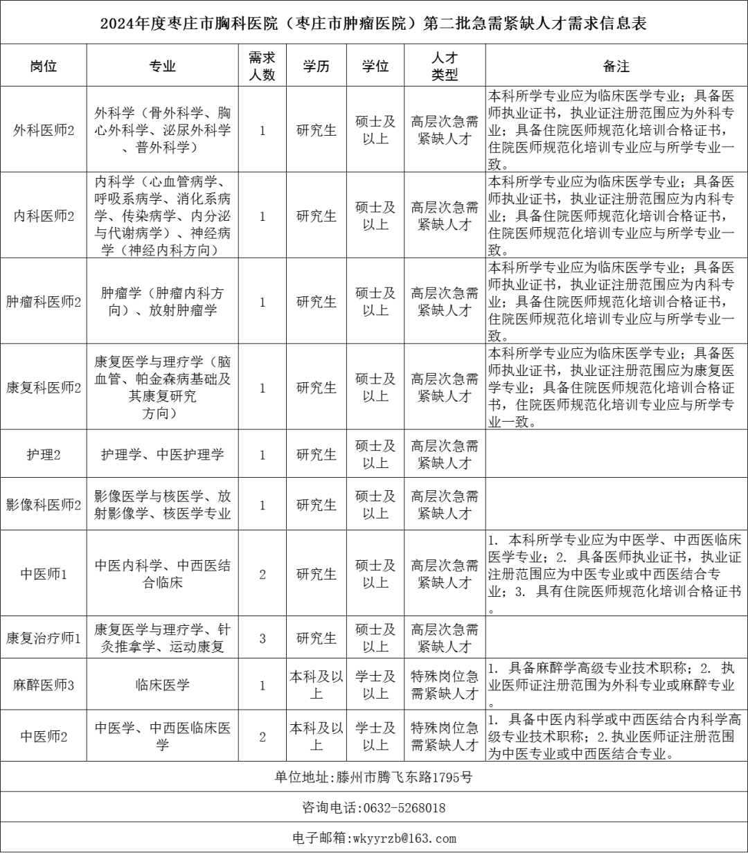 《2024年度枣庄市胸科医院(枣庄市肿瘤医院)第二批急需紧缺人才需求信息表》(附件1)