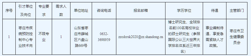 (一)具有中华人民共和国国籍,且无国(境)外永久居留权,年满18周岁,博士40周岁以下((1984年1月至2007年1月期间出生),硕士35周岁以下(1989年1月至2007年1月期间出生);需具备医学教育经历。(三)具有良好的品行和适应岗位的身体条件、心理素质;(五)学历及学位证书、《国家学历学位认证书》均须在2025年7月31日前取得;原则上从市外引进,本市机关事业单位在编在职人员(包含控制总量人员)不得报考,市内机关事业单位在编人员辞职后、自销编之日起3年内不得报考。现役军人、曾受过刑事处罚和曾被开除党籍、公职的人员、被依法列为失信联合惩戒对象的人员、在各级公务员招考中被认定有舞弊等严重违反录用纪律行为的人员以及法律法规规定不得聘用的其他情形人员不得应聘。在读非2025级毕业生不能用已取得的学历学位作为条件应聘。应聘人员不得报考有《事业单位人事管理回避规定》(人社部规〔2019〕1号)中应回避情形的岗位。在编在岗人员、签订劳动合同人员、人事代理人员等需出具有用人管理权限的部门(单位)同意应聘的证明;定向、委培毕业生应聘,需出具征得定向、委培单位同意的报考信函;已经就业或签订就业协议书的毕业生须用人单位出具同意报考证明。报名时间:2025年1月14日9:00—2025年1月17日16:00(以邮箱接收时间为准,逾期不再受理)1.《枣庄市疾病预防控制中心急需紧缺人才公开招聘报名登记表》;6.国家教育部门的学历学位认证材料。应聘人员可登录教育部留学服务中心网站(http://www.cscse.edu.cn)查询认证的有关要求和程序;7.2025年全日制应届毕业生提供学校出具的能够于2025年7月31日前正常毕业的证明材料或本人出具的能够于2025年7月31日前正常毕业的承诺书。市疾病预防控制中心报名邮箱:zzcdcrsk2020@zz.shandong.cn1.报名采取电子邮件报名方式进行。报名人员在规定报名时间内登录“枣庄疾控”微信公众号,下载填写《枣庄市疾病预防控制中心急需紧缺人才公开招聘报名登记表》(附件),将报名表和报名材料以扫描图像的形式打包发送至报名邮箱(邮件名称主题格式为“姓名+学历学位+毕业学校+报考单位”。如:“李xx+博士研究生+××大学+市疾控中心”),邮件发送后应及时与报考单位进行电话确认。报考人员的学历(学位)必须为国家承认的学历(学位)。报考人员的专业应严格按照毕业证书的专业填写。2.资格审查。枣庄市疾病预防控制中心负责对报考人员进行资格初审工作,报名信息一经初审通过,不能更改。因提交报名信息不准确、不齐全、或不符合报考条件等原因影响资格审核的,由报考人员承担相应后果。资格审核贯穿报考全过程。面试采取结构化面试方式,面试主要测试考生组织协调、分析判断、计划决策、逻辑思维、学习创新、语言表达、应变控制、专业素养、仪容仪表等方面能力素质,面试时间不超过15分钟。面试满分100分,合格分数线 70分。面试成绩计算到小数点后两位,面试成绩在面试结束后公布。面试成绩相同的,采取加试的办法确定名次。面试时间、地点等具体事宜另行通知,请注意随时关注“枣庄疾控”微信公众号。招聘岗位按照实有报名合格人数确定参加面试人数,未有报名合格者取消岗位招聘计划。开考比例一般不低于1︰3,确需降低开考比例的由主管部门研究论证。如果最终审核通过的报名人数超过一定数量的,将视情况增加初试环节,按照初试的成绩,从高分到低分,确定进入面试人选,初试成绩不计入面试成绩。初试的方式和时间另行通知。根据应聘人员面试考试成绩,由高分到低分按1:1的比例,确定进入考察、体检范围人选。枣庄市疾控中心组成考察工作组对人选进行考察,并按照资格条件对考察人选进行资格复审。主要考察思想政治表现、道德品质、业务能力和工作实绩等方面情况,并对应聘人员是否符合规定的岗位条件、提供的相关信息材料是否真实准确等进行复审。考察组根据人选考察情况,提出考察合格人选名单。对考察合格人员,统一组织体检。体检参照公务员录用体检标准执行。报考人员不按规定的时间、地点参加体检的,视作放弃体检。对放弃或考察体检不合格造成的空缺,可从考试合格的人员中按考试总成绩由高分到低分依次等额递补。考试、考察、体检合格的拟聘用人员,按规定程序公示,公示期为5个工作日。经公示无异议的,由用人单位填写《事业单位引进高层次人才聘用情况登记表》,按照人事管理权限办理相关聘用手续。对反映问题影响聘用并查实的,不予聘用。在资格审查、体检以及拟聘用阶段出现空缺的,按照面试成绩依次等额递补、公示。聘用单位和受聘人员按规定签订聘用合同,确立人事关系。受聘人员实行试用期制度,试用期包括在聘用合同期限内。期满合格的办理正式聘用手续,不合格的解除聘用合同。1.应聘人员在应聘期间要保持所留联系电话24小时通讯畅通,并及时了解“枣庄疾控”微信公众号发布的最新信息,因本人原因错过重要信息而影响考试聘用的,责任自负。2.报考人员在应聘过程中所提交的所有注册信息和材料应当真实、准确、有效。凡提供虚假信息和材料获取报考资格的,或有意隐瞒本人真实情况的,一经查实,即取消报考或聘用资格。附件:枣庄市疾病预防控制中心急需紧缺人才公开招聘报名登记表
